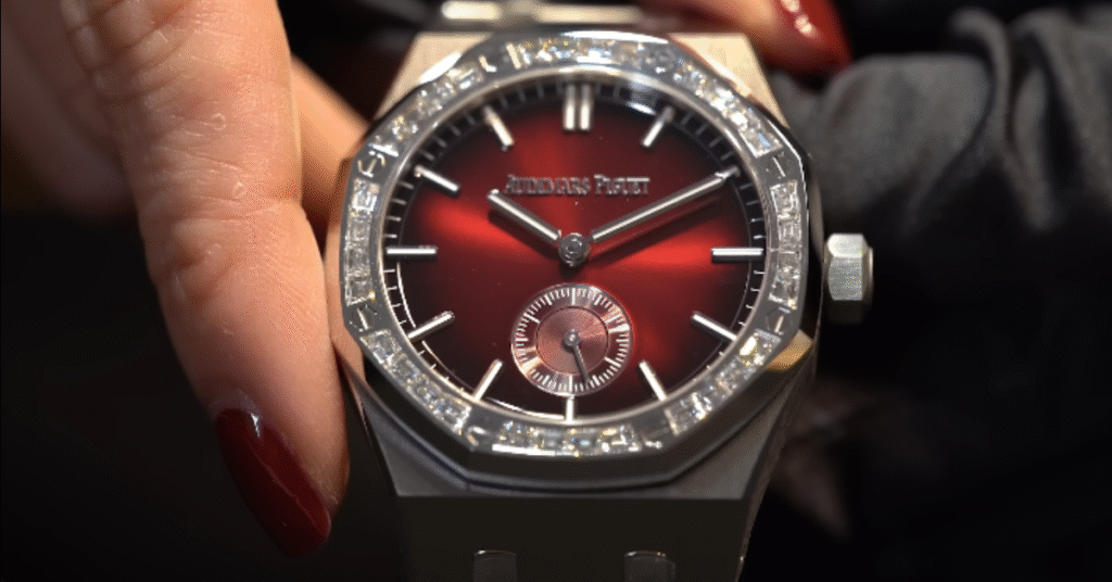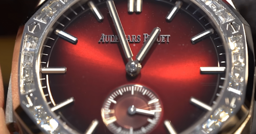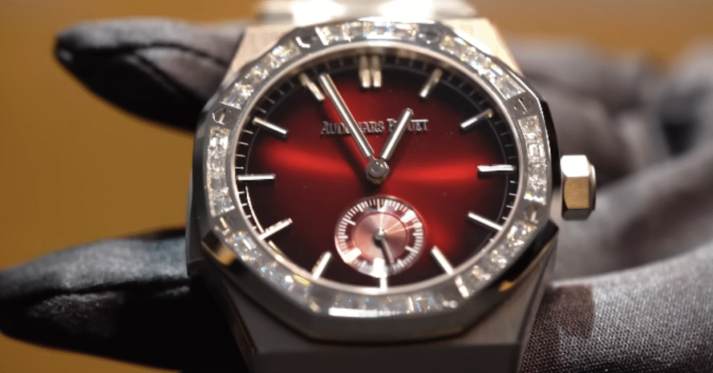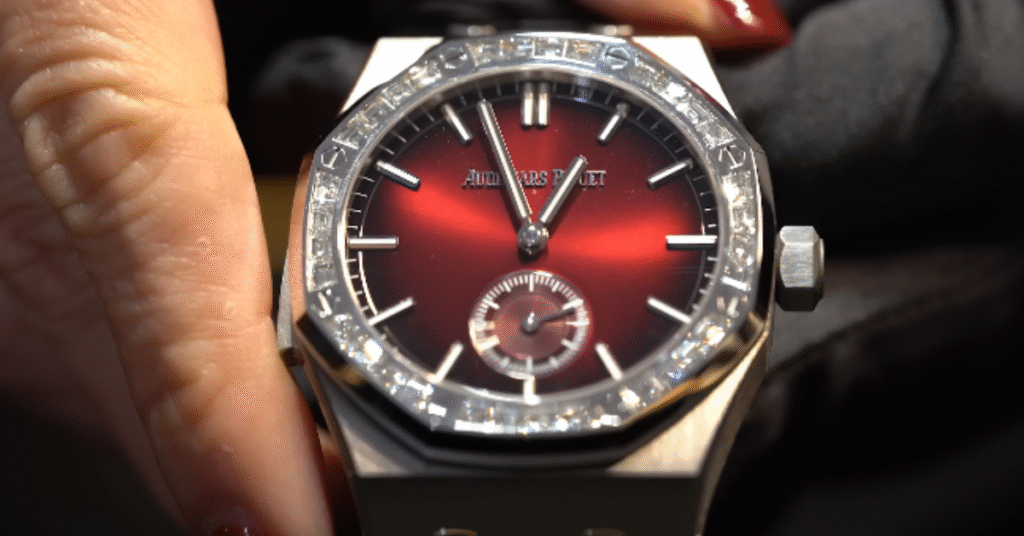 The star of the show is undoubtedly the “Grande Tapisserie” dial in deep, metallic red—a rarity in AP’s typically conservative color palette. The hue shifts from burgundy to crimson under different lighting, its sunburst finish amplifying depth. The textured guilloché pattern, a hallmark of the Royal Oak, ensures legibility while adding visual intrigue.