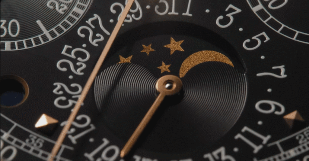 The blued steel hands glide over the dial with quiet authority, their hue shifting from deep indigo to electric blue under different lights. The moonphase aperture at 6 o’clock is a miniature work of art, its celestial disc rendered with a level of detail that rewards closer inspection.